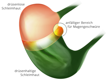 Bei der der Entstehung von Magengeschwüren liegt ein Ungleichgewicht der magenschleimhautschützenden Stoffe und der Verdauungssäfte vor. Durch eine zu hohe Produktion von Magensäure kommt es zur Schädigung und einer Mangeldurchblutung der Schleimhaut. Es entsteht ein Magengeschwür. Die Geschwüre entstehen besonders im Bereich des Übergangs von der drüsenlosen Schleimhaut (oberer Magenbereich) zur drüsenhaltigen Schleimhaut (unterer Magenbereich)
